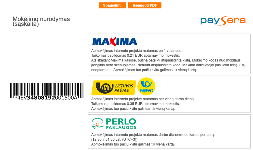 Pateikite šią sąskaitą artimiausiame prekybos centre „Maxima”, bet kurioje kasoje, “Perlas” terminale arba Lietuvos pašte.