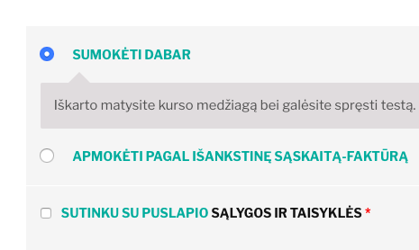 Pasirinkite norimą kursą ir pažymėkite “Sumokėti dabar” ir “Sutinku su puslapio sąlygos ir taisyklės”: