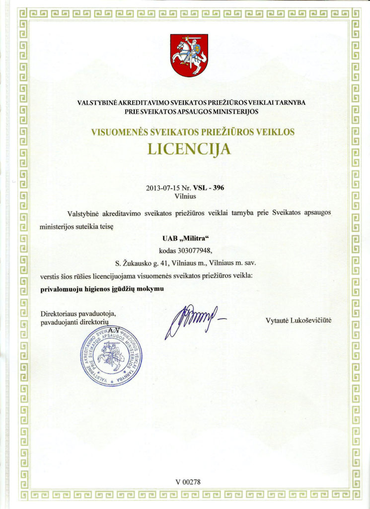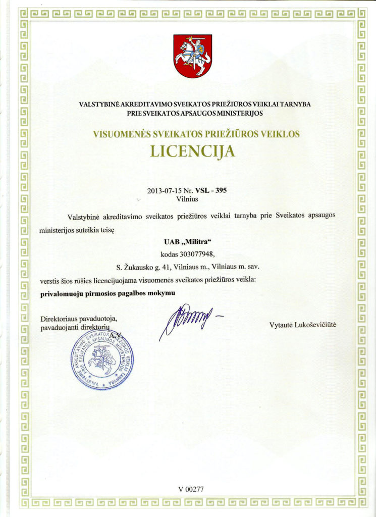 Veiklą vykdome remiantis teisės aktais. Valstybinė akreditavimo sveikatos priežiūros veiklai tarnyba prie Sveikatos apsugos ministerijos suteikė licencijas išduoti Pirmos pagalbos bei Higienos kursų baigimo pažymėjimus.